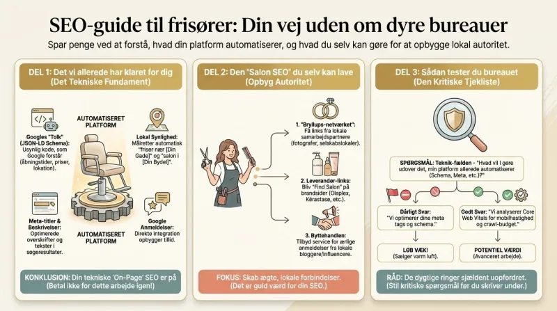 Hvis du ejer en salon eller lejer en stol, kender du sikkert situationen. Du står med hænderne fulde midt i en balayage, og telefonen ringer. Det er (endnu) en sælger fra et webbureau, der lover at få dig til at ligge nr. 1 på Google mod et fast månedligt beløb.
